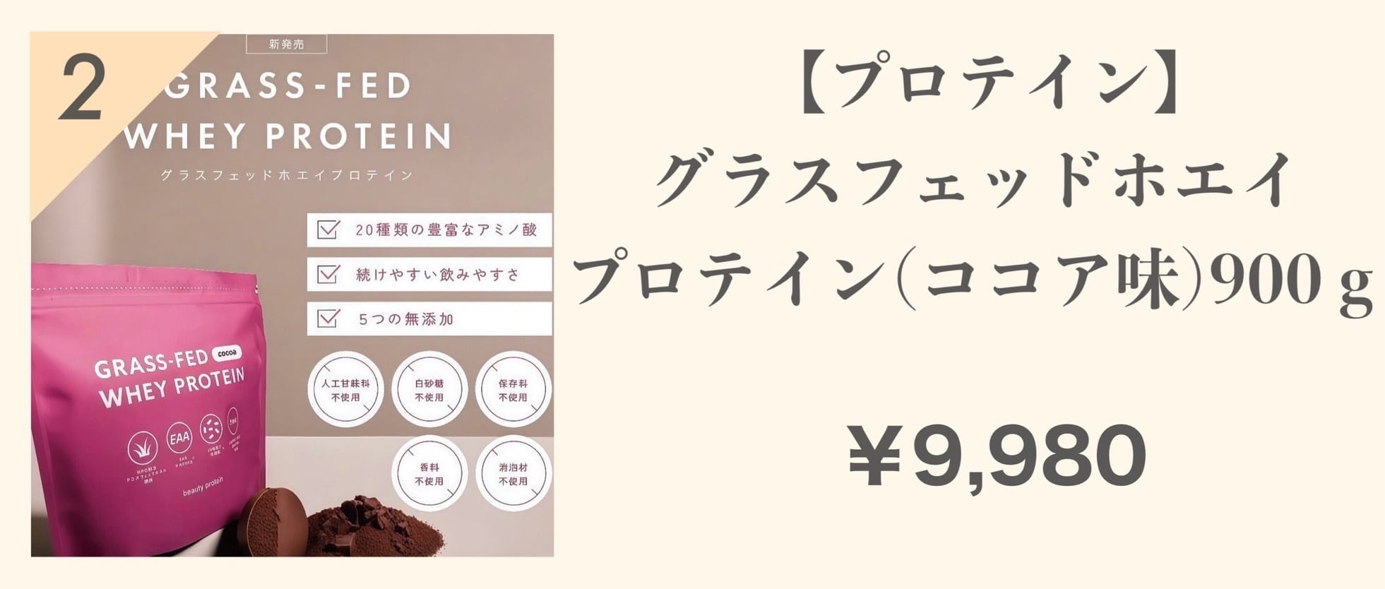 【グラスフェッドホエイ ビューティープロテイン】 オーストラリアの大草原の牧草のみで育った乳牛の乳清のみを原料に使用したホエイプロテイン。 美味しく飲みやすいココア風味です。 《WPC製法》 Whey Protein Concentrate製法で作り上げました。 《豊富な必須アミノ酸》 9種類の必須アミノ酸を含む20種類の全てのアミノ酸をバランス良く摂取することが可能です。 《4つの無添加》 人工甘味料、白砂糖、保存料、香料は使用しておりません。 《飲みやすいから続く》 飲みやすさは、シルクプロテインのまま! 「美味しくないと続かない!」 続かないとどんな良い商品でも効果が出ません。 《内容量》 900g (1回30g × 30回分) 《名称》 たんぱく質加工食品 《原材料名》 ホエイたん白濃縮物(オーストラリア製造)、ココアパウダー、食塩、乳等を主要 原料とする食品、植物性乳酸菌末(殺菌)、難消化性デキストリン/甘味料(ステビア)、(一部に乳成分を含む) 《栄養成分表示》 1食(30g)あたり ・エネルギー:118kcal ・たんぱく質:20.8g ・脂質:2.1g ・炭水化物:4.2g ・食塩相当量:0.2g アミノ酸スコア100:最高値は100です。必須アミノ酸全てが理想に近い形で含まれています。 ◇食生活は、主食、主菜、副菜を基本に、食事のバランスを。 《保存方法》 直射日光・高温多湿の場所を避けて保存してください。 《お召し上がり方》 栄養補助食品として1回約30g(付属スプーン約3杯分)を目安に、シェイカーを使用し水(200cc~300cc)に溶かしお飲みください。 《ご使用上の注意点》 ●乾いたスプーンを用い、こ使用のたびにチャックをしっかりお閉めください。 ●体質に合わない方は、摂取を中止してください。 ●食物アレルギーのある方は原材料名表示をご参照ください。 ●薬を服用している方、通院中の方は担当医にご相談の上ご使用ください。 ●幼児の手の届かない所に保存してください。
