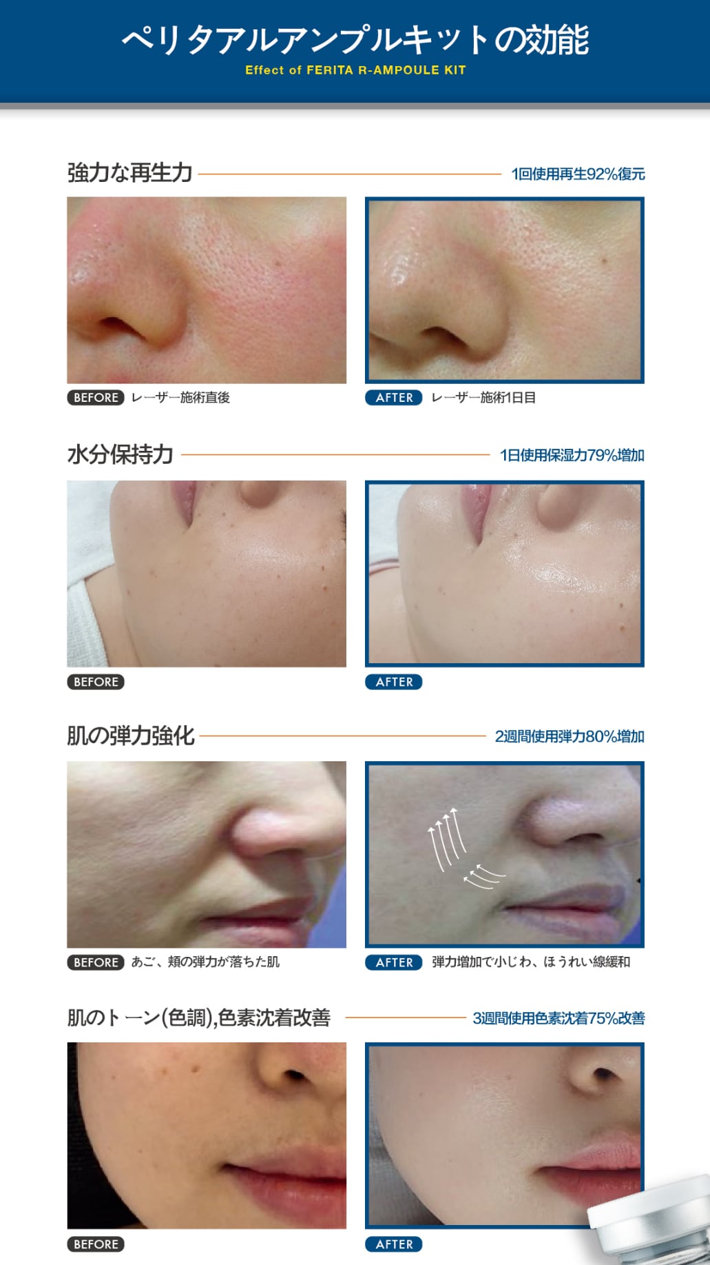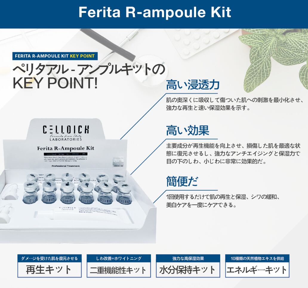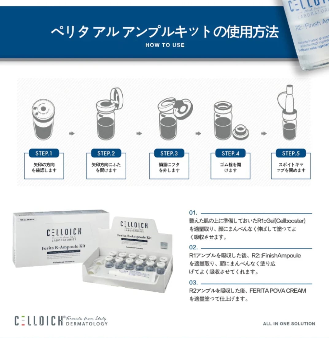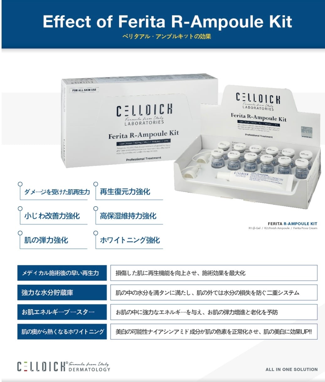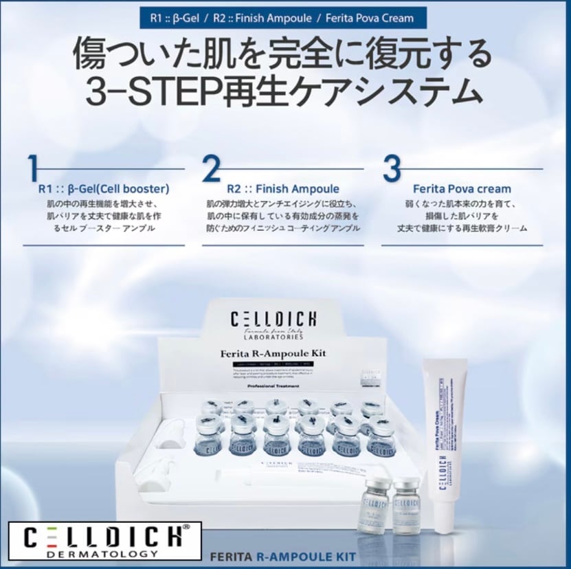 R1 β-Gel(セルブースター)で肌の再生機能を高め、バリアを強化。R2 フィニッシュアンプルで保湿とアンチエイジング、外部刺激から守り、Ferita Pova Creamで弱った肌本来の力を育て、健康な肌へ導きます。