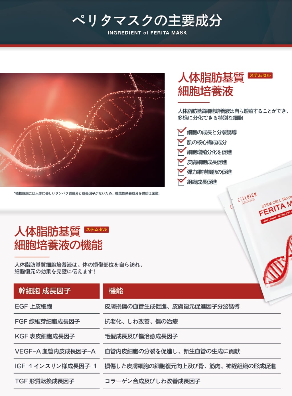 さらに、ヒト脂肪由来幹細胞培養液を配合し、肌のターンオーバーをサポート。EGFやFGFなど成長因子が、肌本来の美しさを引き出します。