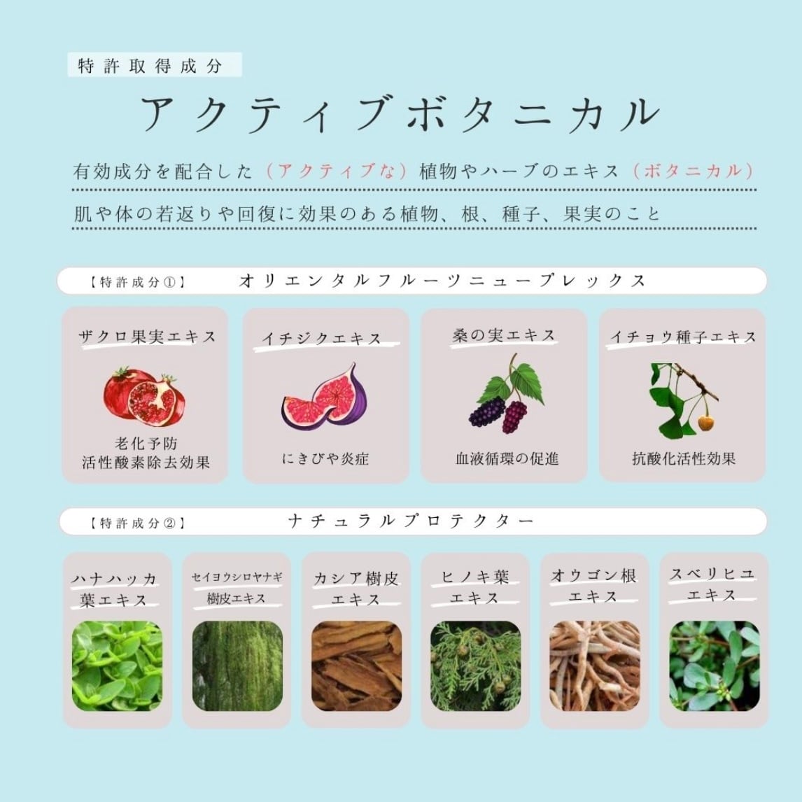 医療グレードの最先端成分(配合量や精製クオリティ)と、特許取得済アクティブボタニカル(肌や体の若返りや回復に効果のある植物、根、種子、果実)を配合。