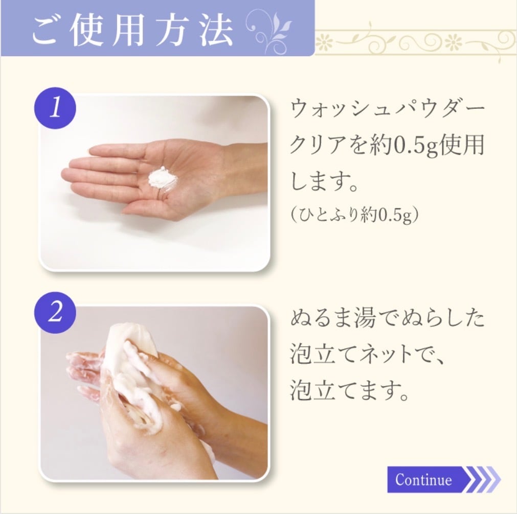 ①ウォッシュパウダークリアを約0.5g使用します。(ひとふり約0.5g)
