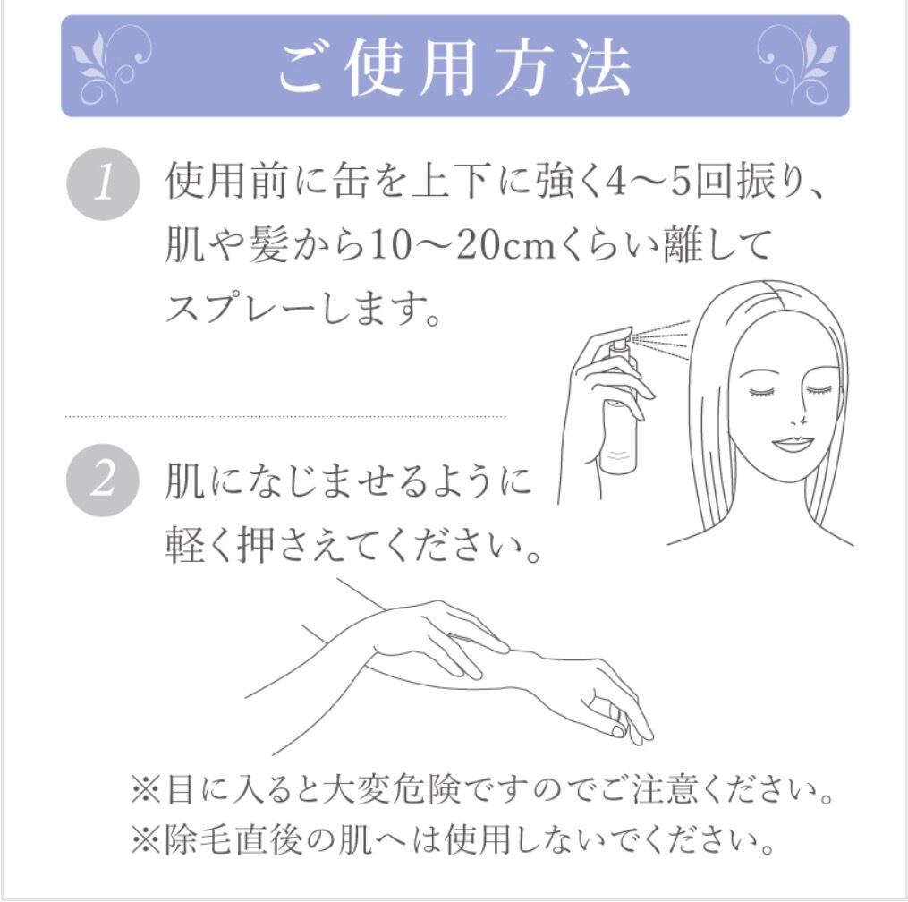 使用前に必ず缶を上下に強く4~5回振り、肌や髪から10~20cmくらい離してスプレーしたあとムラなくのばします。