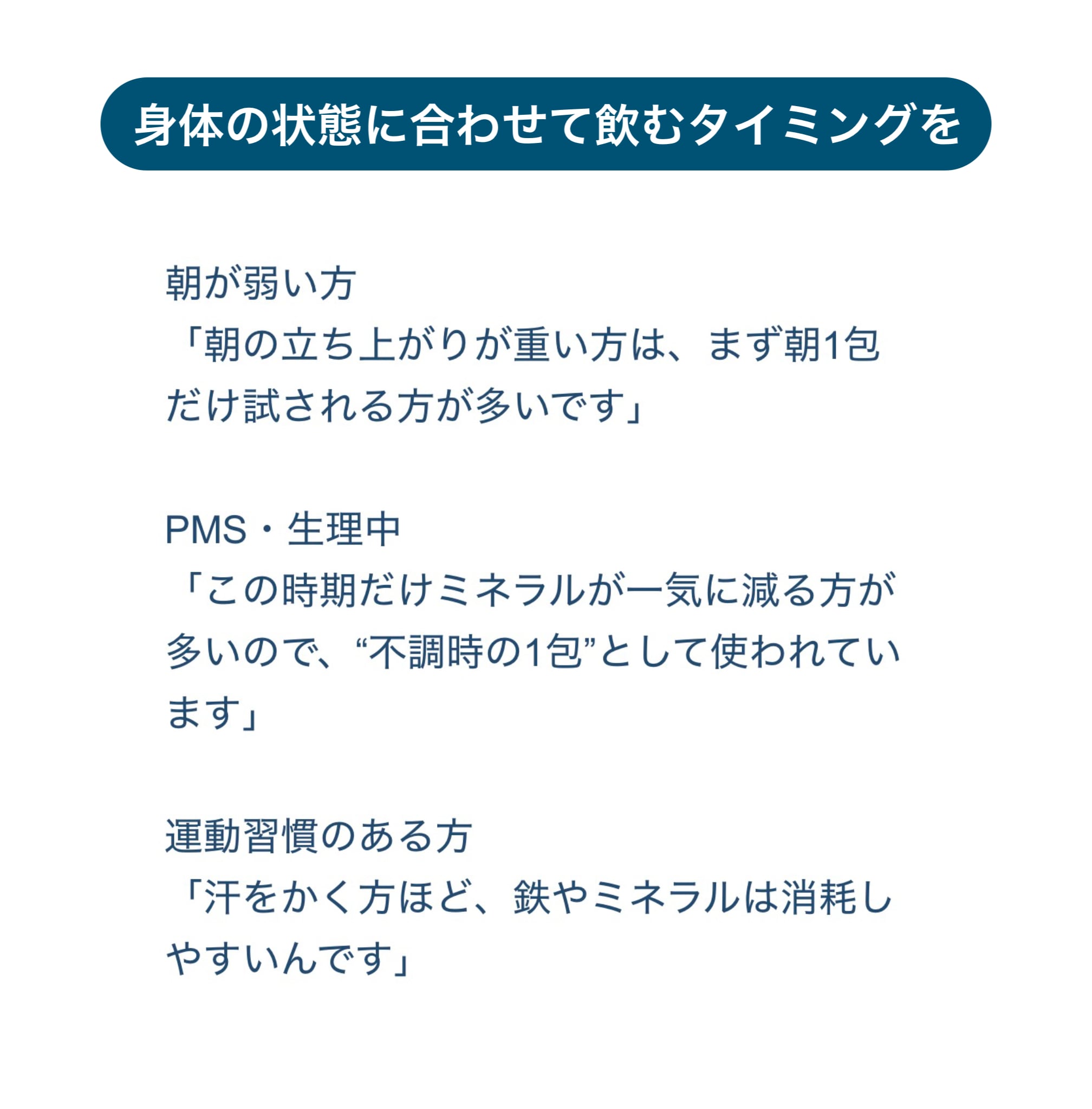 液状タイプのMINERALionは、そのままはもちろん、水や白湯、炭酸水に混ぜるだけで自然に取り入れられる分包タイプです。朝の始まり、仕事の合間、お風呂上がり、眠る前——いつもの習慣に重ねてお使いできます。