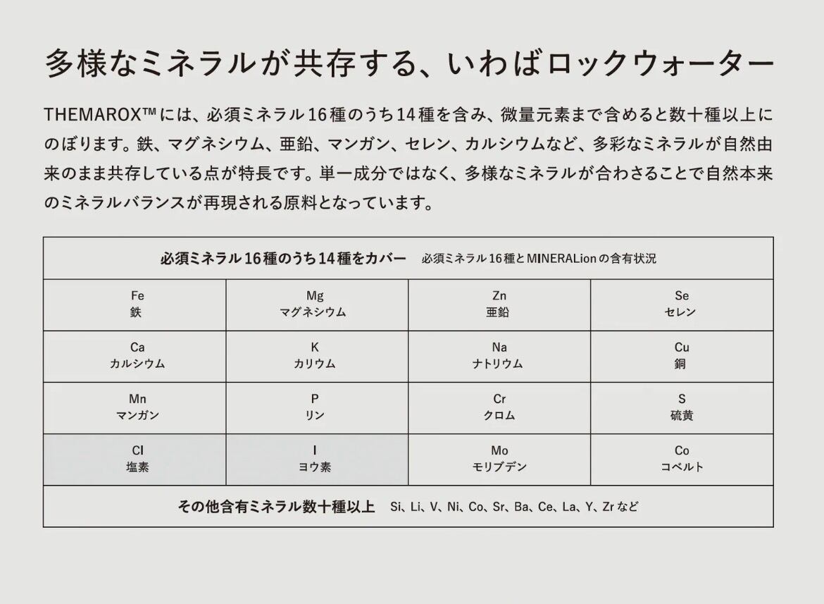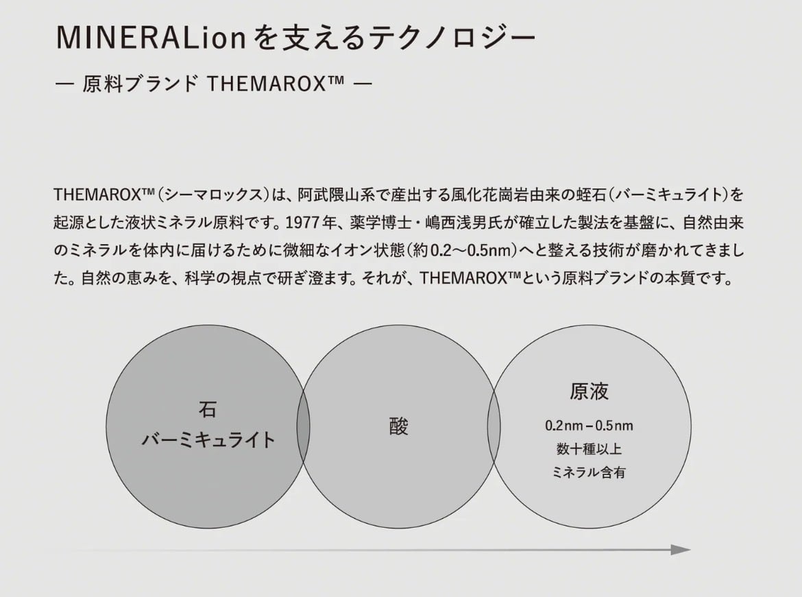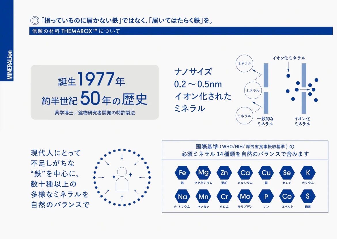 MINERALionは、風化花崗岩由来のミネラル溶液「THEMAROX™(シーマロックス)」を活用したイオン化技術によって鉄・ミネラルを0.2〜0.5ナノメートルに微細化しました。水に溶けやすく、からだの中で無理なく取り扱われる形へ。 「摂っているのに変化を感じにくい」という声に、吸収設計の視点から応えるアプローチです。