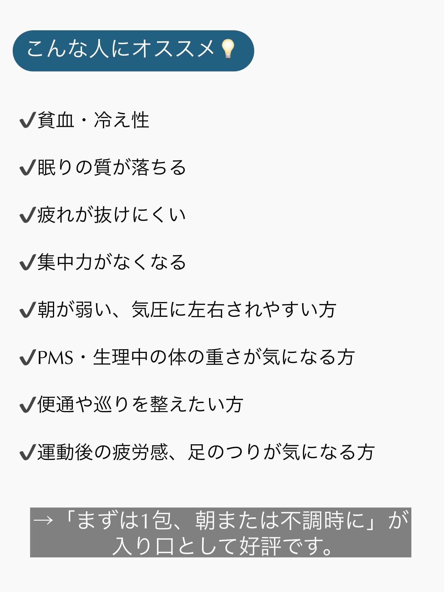 →「まずは1包、朝または不調時に」が入り口として好評です。