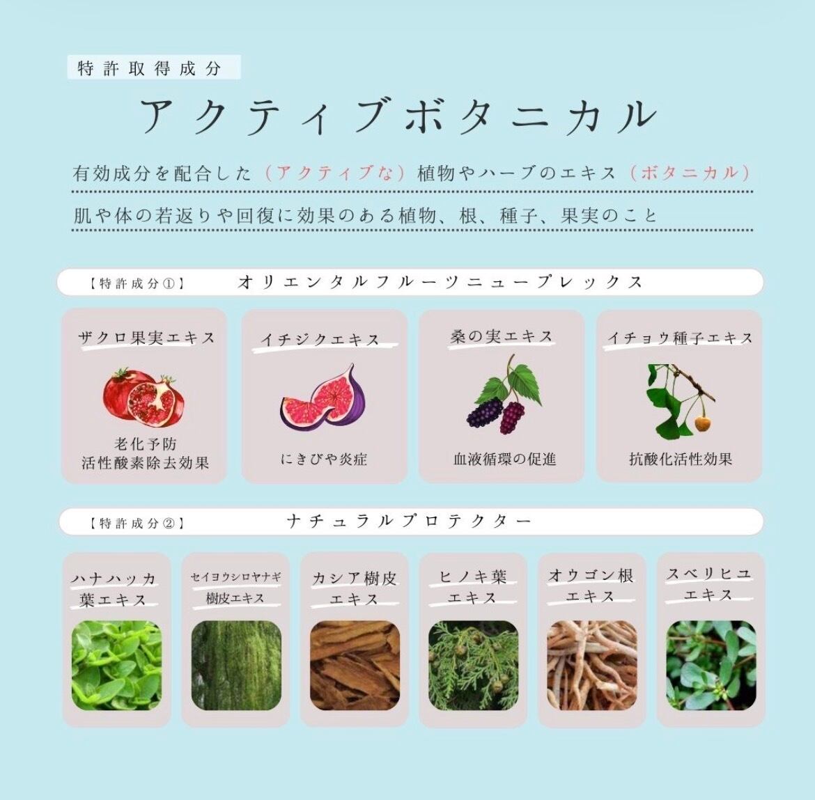 医療グレードの最先端成分(配合量や精製クオリティ)と、特許取得済アクティブボタニカル(肌や体の若返りや回復に効果のある植物、根、種子、果実)を配合。